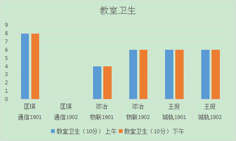 从图表可以看出,物联2001班、物联1901班、物联1902班、城轨1901、城轨1902班的教室卫生不理想,扣分较多。相比与其他班级,物联1901班扣分较为严重,希望辅导员与卫生委员加强管理。