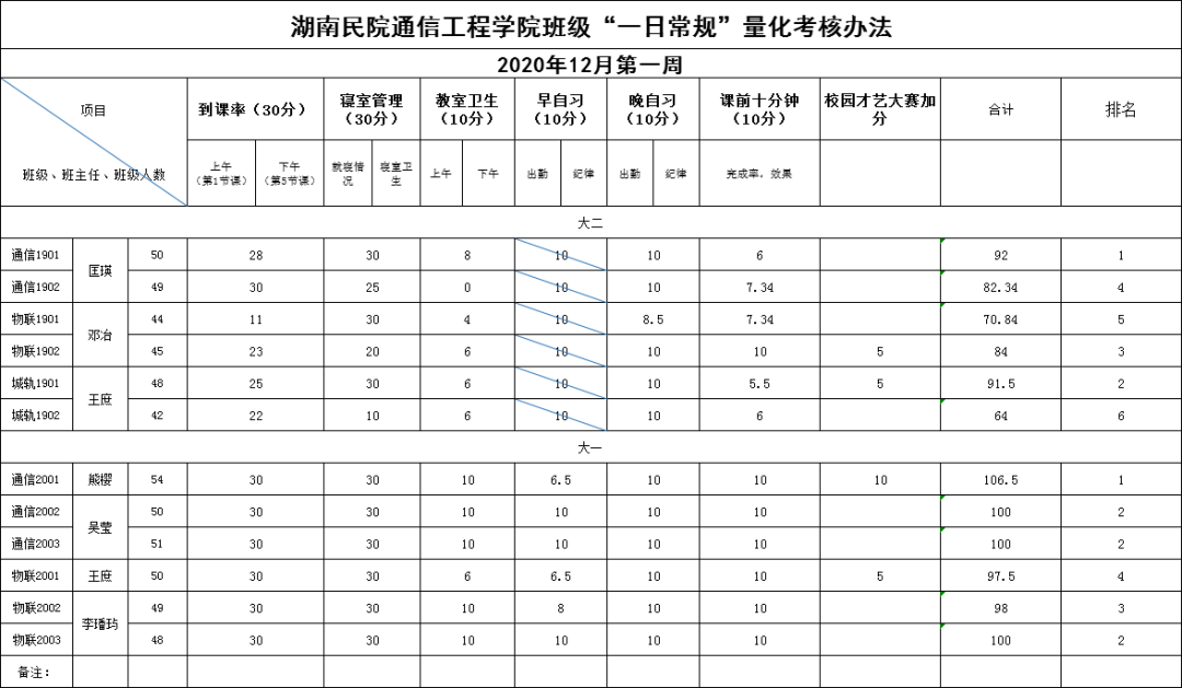 从整体看出,第十三周的考核情况:第一名通信1901班和通信2001班,其他班级需再接再厉,争创佳绩,希望下一周辅导员继续加强管理并督促员工提升自我管理能力,相信在今后的日子里我们能一起踏风而来,蔚然成风!