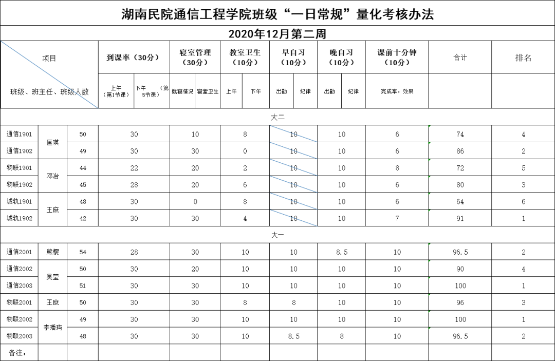 第十二周班级考核表