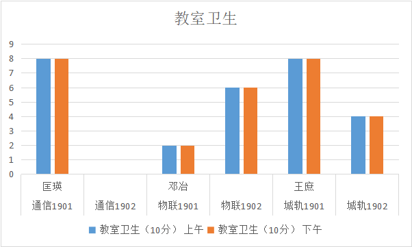 教室卫生情况,物联2001班、物联1901班、物联1902班、城轨1902班扣分情况有待提高,其他班级表现良好。希望各班辅导员和卫生委员加强管理,继续保持教室卫生,让教室更加干净整洁,有个好的学习氛围。