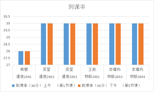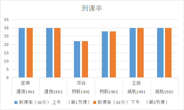 从表中可以看出,本周各班表现都非常好,其中通信2001班、物联1901班、物联1902班的同学们到课率有待提高,希望同学们再接再厉。