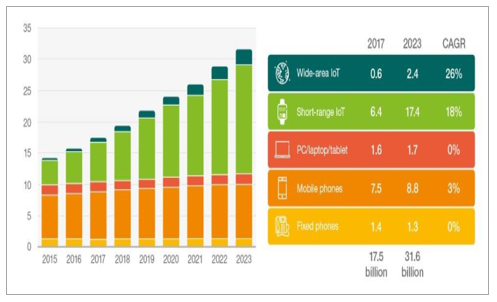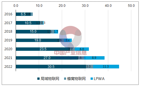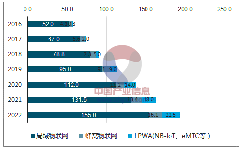 (2)2022年预测:全球物联网终端总数达到193.1亿部,其中蜂窝物联网16.1亿部(CAGR25%)、LPWA22.5 亿部(CAGR76%)、局域物联网155.0亿部(CAGR19%)。