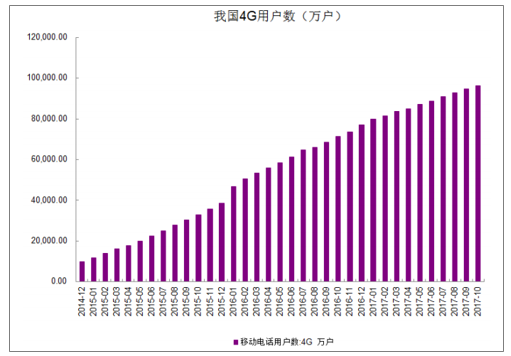 4G用户数迅猛增加:截至2017年10月,我国4G用户数达9.62亿户,渗透率达68.54%。人类对网络的需求持续扩大,(固网+无线)互联网流量持续以40%以上的复合速率爆发式增长,拉动信息基建持续投资。