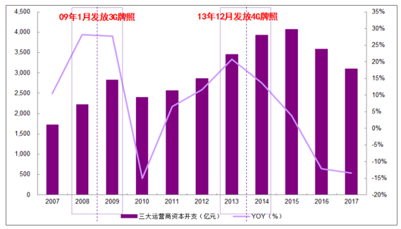 G/4G牌照发放前后一年运营商资本开支增速到达高峰