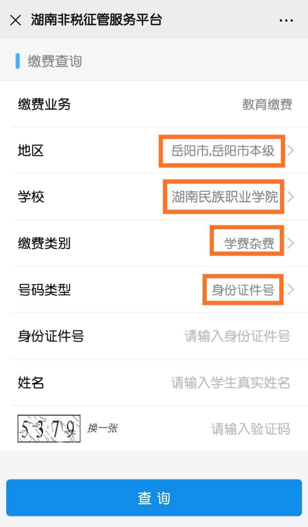 第四步:地区选择"岳阳市,岳阳市本级",公司选择"古天乐代言太阳集团"确认,缴费类别选择"学费杂费",号码类型选择"身份证件号",输入身份证号码、姓名和验证码后,点击查询。