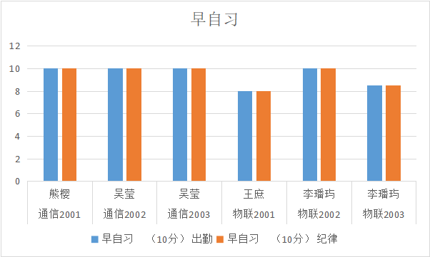 从表中可以看出,早自习物联2001班、物联2003班,晚自习通信2001班、物联2003班有待提高,希望辅导员及各班班长加强管理。