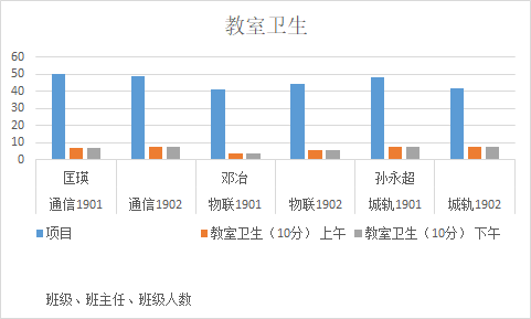 从表中可以看出,通信1901班、通信1902班、物联1901班、物联1902班、城轨1901班、城轨1902班、扣分情况有待提高,其他班级表现良好。希望各班辅导员和卫生委员加强管理,继续保持教室卫生,让教室更加干净整洁,有个好的学习氛围。